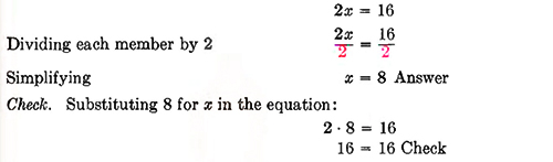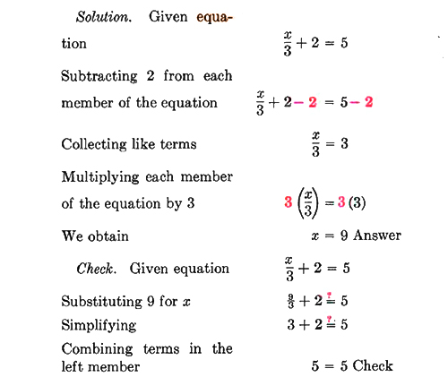 as well as in sports, it is necessary that we become familiar with the rules and procedures which will help us do a satisfactory job. Solving equations is an important part of algebra. Thus far we have been able to solve all equations by inspection. Later, with more difficult equations we will need to apply systematic methods to solve them. In the next few paragraphs, we will discuss some of these methods. The equations we will solve for the present will still be simple ones, and we will probably be able to give the answers by inspection, but we must be sure that we follow closely the new methods, and be sure that we understand each method that is explained.
