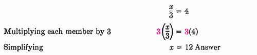 corresponds to the number of units of weight on the left side of the scales, and the right member of the equation corresponds to the number of units of weight on the right side of the scales. If we triple (multiply by 3) the number of units of weight on each side of the scales, the scales will remain in balance. This can be compared to the equation x = 12, and we have found the value of x in the equation x/3 = 4.