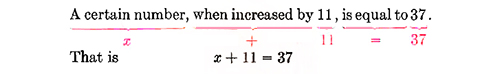 Solution of simple equations. An equation such as x + 11 = 37 may be expressed verbally as "There is some number which, when increased by 11, equals 37." The equation may also be worded as a question: "What number, when increased by 11, equals 37?" To solve this equation is to find the number which answers the question. The answer here is clearly 26. In an equation, the letter whose value we are seeking is usually referred to as the unknown letter or the unknown. The value of the unknown letter which makes the equation true is said to be the value that satisfies the equation.