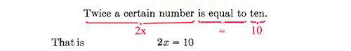 Solution. We represent the certain number by x. Twice the certain number can then be represented by 2x. Next we translate the sentence into algebraic symbols as follows:
