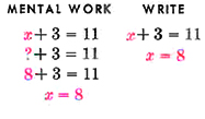 Solution. The equation asks the question, "What number, when added to 3, gives 11?" The answer is 8. It is unnecessary to indicate every step in writing your solution. With practice you will ask the question mentally and then write the answer beneath the original equation. |