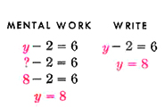 Solution. The equation asks, "Two subtracted from what number equals 6?" Since 2 subtracted from 8 gives 6, the answer is 8. |