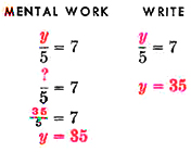 Solution. The equation asks, "What number, when divided by 5, equals 7?" Since 35 divided by 5 equals 7, the answer is 35. |