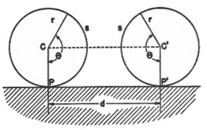 Consideremos el círculo a la izquierda en la figura 10, que indica la posición original de una rueda. La rueda gira de modo que el centro se mueve a lo largo de la línea CC′, donde C′ es el centro de la rueda en su posición final.