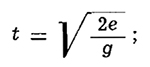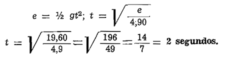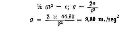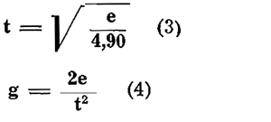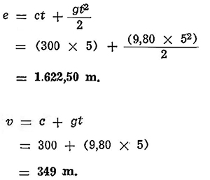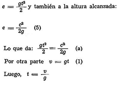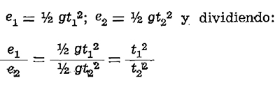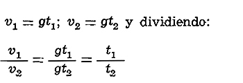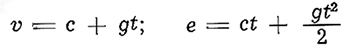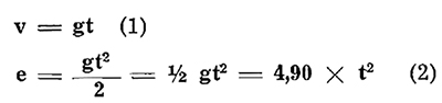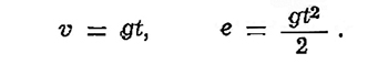 En el movimiento de la caída de los cuerpos, el espacio e, la velocidad v y el tiempo t están ligados por las dos fórmulas: