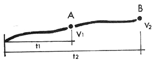Ejemplo. Un móvil pasa por un punto A con velocidad v1 (figura 10) en el instante t1 y por el punto B con velocidad v2 en el instante t2.