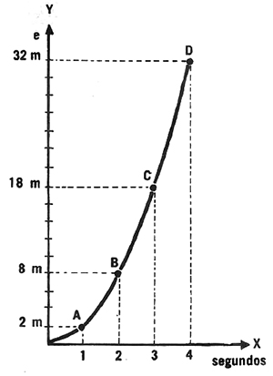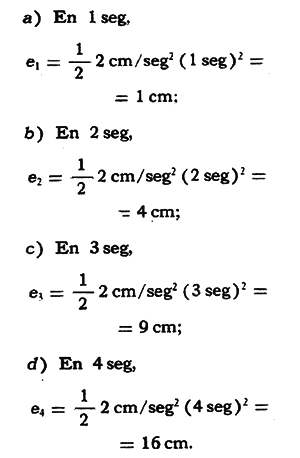 Por lo tanto, si en 1 seg recorre 1 cm; en 2 seg, 4cm (22 ); en 3 seg. 9cm (32); en 4seg, 16cm (42), se ve que el espacio varía con el cuadrado del tiempo.