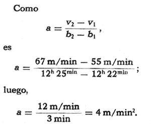 Un móvil pasa por la localidad A, a razón de 55 m/min, a las 12:22 horas, y por la localidad B, a razón de 67 m/min a las 12:25 hs. ¿Cuál es la aceleración del móvil?