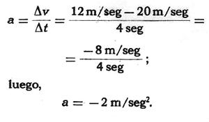 En este caso, la aceleración es negativa, pues el móvil ha disminuido su velocidad a razón de 2 m/seg cada segundo.