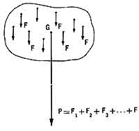 Según lo estudiado para las fuerzas paralelas de igual sentido, la resultante es igual a la suma de todas as intensidades de las fuerzas dadas: para este caso, la suma de todas las fuerzas F nos da el peso del cuerpo, representado por el vector P.