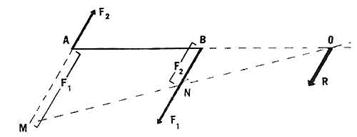 Figura 11. Método gráfico para calcular R entre dos fuerzas F, paralelas de sentido contrario.