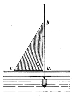 Si con dos puntadas se hace coincidir el cateto ab de una escuadra de dibujante con el hilo de una plomada que se va sumergiendo en el agua de una vasija, se nota que al alcanzar el líquido el otro cateto ac, coincide exactamente con la superficie libre del agua.