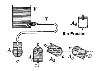 Si se llena de agua el aparato, se hincha la cápsula, indicando así la existencia de una fuerza ejercida por el liquido. El resultado es idéntico, cualquiera que sea la orientación de la cápsula (A, A1, A2, A3).