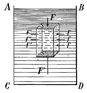 Al contrario, las presiones F y F' que se ejercen respectivamente sobre las bases S y S' han de ser de ser desiguales, para mantener el equilibrio a pesar de la gravedad o peso del prisma liquido.