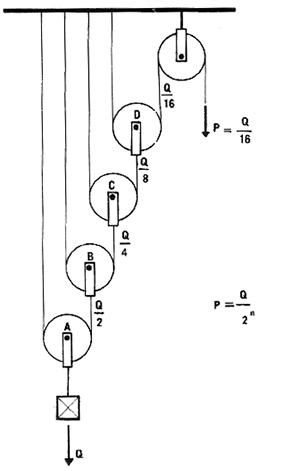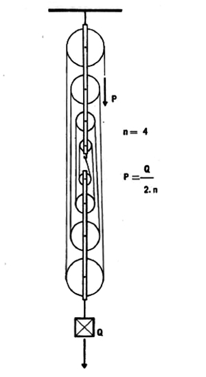 La resistencia pende de la última polea móvil. Observemos enla figura 7 cómo va pasando la soga por todas las poleas. En el extremo libre aplicamos la potencia, que hará subir a la armadura de las poleas móviles. El diámetro de las poleas aumenta hacia los extremos, para lograr el paralelismo de las sogas en sus distintas partes; de tal modo se obtiene la disposición más ventajosa.