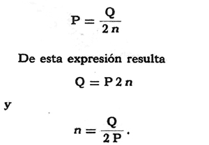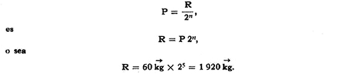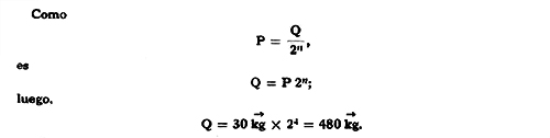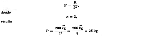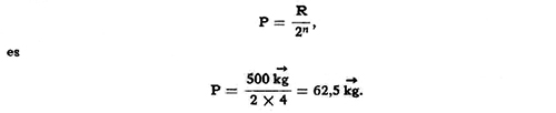 que permite calcular la resistencia conociendo la potencia y el número de poleas móviles. El número de poleas n se puede obtener en base a logaritmos. Observamos que el divisor varía con las potencias menores de 2; por ello, se llama aparejo potencial.