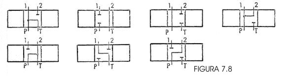 Existen otras configuraciones de corredera usadas en circuitería hidráulica. A continuación se muestran válvulas con diferentes conexionados en posición central (todas de cuatro vías, tres posiciones). En la Fig. 7.8 se dibujan únicamente las conexiones correspondientes al bloque central, cuando la corredera está en posición “neutral”.