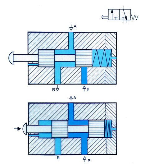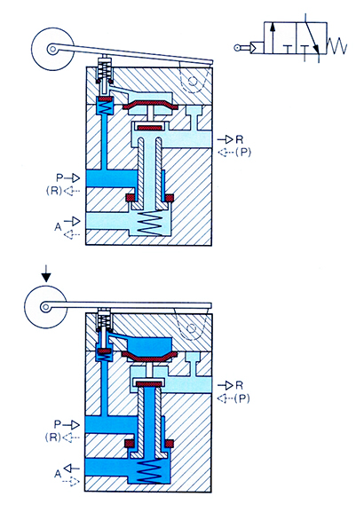 Al accionarse la leva, se cierra primero el paso entre A y R, luego la bola permite el paso de P hacia A. Al efectuar