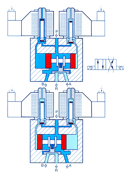La inversión de la válvula de cursor plano se realiza por válvulas 3/2 vías accionadas por solenoides incorporados.