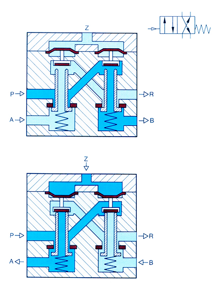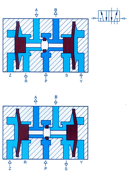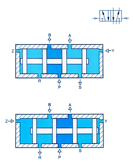 La inversión de esta válvula se realiza a través de impulsos neumáticos por los orificios Z e Y, por un émbolo doble