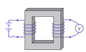 - La tensión aplicada al devanado primario produce un campo magnético (flujo) en el núcleo, que acopla ambos devanados. (Voltage applied to the primary winding produces a magnetic field (flux) in the core that couples both windings.)