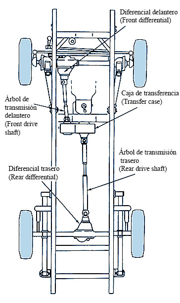 Fig.: Transfer case installed in a four-wheel drive truck - Caja de transferencia instalada en un camión de tracción en las cuatro ruedas