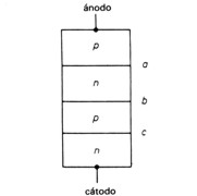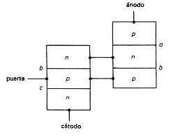 Supongamos que este dispositivo tiene una pequeña tensión positiva de ánodo, pero está en el estado de no conducción. Las uniones a y c estarán polarizadas en directo y la b en inverso: éstas son las condiciones normales de los dos transistores componentes para funcionar como amplifícadores. Cuando se aplica una tensión positiva entre el ánodo y el cátodo, aumenta la polarización directa del transistor npn, haciendo que la corriente atraviese la unión c, y esto, por acción normal del transistor, provoca una corriente de colector en la región interna n, que es también la base del transistor pnp. Por amplificación en el transístor pnp, éste provoca una corriente de colector en la región interna p que es también la región de base del transistor npn. De esta forma, tiene lugar la reafimentación positiva, y si la ganancia de corriente combinada de los dos transistores excede la unidad, la realimentación es regenerativa, ocasionando un rápido incremento de corriente que pone al dispositivo en el estado de conducción. La tensión de puerta puede eliminarse ahora, pero el tiristor permanecerá conduciendo hasta que la corriente que lo atraviesa caiga por debajo del valor crítico, presentando así el comportamiento típico de un multivibrador biestable. De la simetría de la estructura del dispositivo se deduce que el tiristor podría dispararse también por una señal negativa aplicada a la región interna n. Por lo tanto, hay dos tipos de tiristor triodo de bloqueo inverso; uno con una puerta p (puerta de cátodo) y el otro con una n (puerta de ánodo). También existen los correspondientes tiristores triodos de conducción inversa y un tipo que puede dispararse al estado de no conducción, conocido como tiristor de conmutación inversa . Un tiristor muy útil puede construirse a partir de dos tiristores triodos en paralelo e invertidos, con una conexión de puerta común. Esto se conoce como triac, y puede hacerse conducir por medio de una señal positiva o negativa aplicada a la puerta . Si se hacen conexiones externas a ambas capas internas de una estructura pnpn, el tiristor así obtenido puede dispararse al estado de conducción y no conducción mediante señales apropiadas aplicadas a una de las dos puertas. Este es un tiristor tetrodo conocido también como interruptor controlado de silicio, que se usa, entre otras aplicaciones, como oscilador de campo en receptores de televisión.