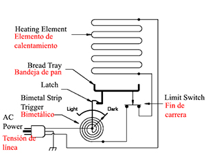 La figura muestra una representación esquemática de un tostador de pan ordinario típico. El pan se coloca en la ranura y se apoya en una bandeja de pan. Cuando la bandeja se baja, ésta cierra un interruptor de fin de carrera y se fija en su lugar. Cuando las resistencias calentadores cocinan el pan, la tira bimetálica enrollada se calienta y, finalmente, tira del pestillo para que salte la bandeja del pan. Al ajustar la precarga en la tira bimetálica enrollada, se puede ajustar el tiempo de inactividad y se puede controlar el color tostado de la tostada . |