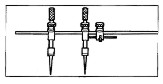(*) Notes: When scribing circles, arcs, and radii that are too large to be produced with the divider, a trammel should be used (see figure above ). The trammel is made of three main parts: the beam, two sliding heads with scriber points, and an adjusting screw that is attached to one of the heads. The trammel can be made to scribe larger distances with the use of extension rods. This layout tool is set in the same manner as the divider. |