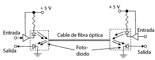 Las fibras ópticas en la transmisión se están utilizando en lugares de la planta donde las condiciones son duras (campos magnéticos intensos que influyen sobre la señal,...). Los módulos de transmisión pueden ser excitados por fuentes de luz de LED (Light Emiting Diodes) o diodo láser. Los módulos receptores disponen de fotodetector y preamplificador, con los cables o multicables de fibra óptica y con convertidores electroópticos. La transmisión de datos puede efectuarse con multiplexores transmitiendo simultáneamente a la velocidad máxima definida por la norma RS232 de transmisión de datos para módems y multiplexores. Las ventajas de la transmisión por fibra óptica incluyen la inmunidad frente al ruido eléctrico (interferencias electromagnéticas), el aislamiento eléctrico total, una anchura de banda mayor que la proporcionada por los correspondientes hilos de cobre, ser de pequeño tamaño y de poco peso, sus bajas pérdidas de energía, y que las comunicaciones sean seguras.
