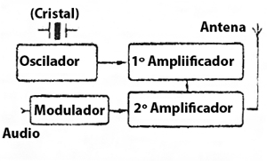 Analizando un transmisor por medio de un diagrama en bloques, como muestra la figura siguiente, vemos que la primera etapa del circuito es justamente un oscilador que puede admitir diversas configuraciones. En los circuitos más simples que operan en frecuencia única como las emisoras de radiodifusión, el oscilador es controlado por un cristal de cuarzo a veces en una cámara térmica de modo de impedir cualquier desvío de frecuencia por variaciones de temperatura.