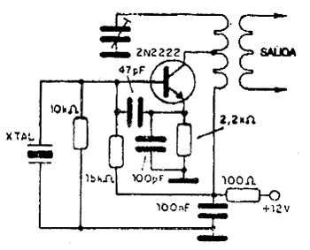 En la figura siguiente tenemos un circuito típico de un oscilador con cristal usado en radio transmisión.