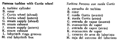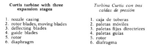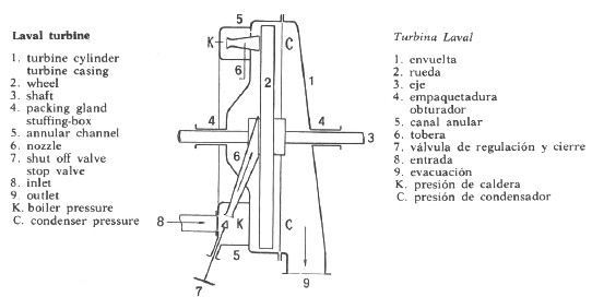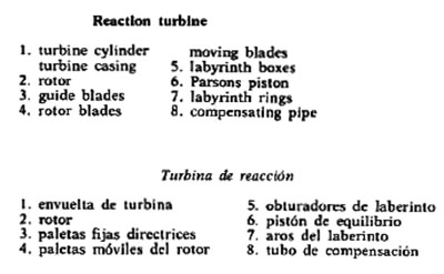 | Turbine, turbina ( Ingeniería mecánica ) Máquina de aceleración del fluido para generar energía mecánica rotatoria a partir de la energía de un chorro de fluido; water turbine, turbina de agua; action turbine with pressure stage, turbina de acción plurietápica; ahead turbine, turbina de marcha hacia delante; auxiliary turbine, turbina auxiliar; axial flow turbine, turbina de flujo axial; back pressure turbine, turbina de contrapresión; blow down turbine, turbina de flujo rápido; closed cycle turbine, turbina de circuito cerrado; combined turbine, turbina combinada; combustion turbine, turbina de gas; condensing turbine, turbina de condensación; condensing extraction turbine, turbina de condensación y extracción; conical turbine, turbina de corona cónica; cooling turbine, turbina de enfriamiento; cruising turbine, turbina de crucero; disc turbine, turbina de disco o de plato; divided turbine, turbina de división parcial; double extraction turbine, turbina de doble extracción; drum turbine, turbina de tambor; exhaust steam turbine, turbina de vapor de escape; extraction turbine, turbina de extracción; Francis turbine, turbina Francis; gas turbine, turbina de gas; high pressure turbine, turbina de alta presión; horizontal turbine or horizontal shaft turbine, turbina horizontal; hydraulic turbine ; turbina hidráulica; impulse turbine, turbina de acción; impulse reaction turbine, turbina de accion y reacción; internal combustion turbine, turbina de combustion interna; jet turbine, turbina a reacción; Kaplan turbine, turbina Kaplan; low pressure turbine, turbina de baja presión; non condensing turbine, turbina de contrapresión y extracción; partial turbine or turbine with variable admission, turbina de distribución parcial; pipe turbine, turbina tubular; pressure turbine, turbina a reacción; pressure compounded turbine, turbina de presiones escalonadas; process turbine, turbina de contrapresión; propeller turbine, turbopropulsor; propulsion turbine, turbina de propulsión; radial turbine, turbina radial; reaction turbine, turbina de reacción; reheat turbine, turbina de vapor recalentado, reheating turbine, turbina de recalentamiento; reverse turbine, turbina de reversible; reversing turbine, turbina de inversión; side by side turbine, turbina compuesta; single stage turbine, turbina monoetápica, superposed turbine, turbina superpuesta (de extracción de vapor); syphon turbine, turbina aspirante; top or toping turbine, turbina de extracción de vapor; velocity compounded turbine, turbina de velocidades escalonadas; vertical or vertical shaft turbine, turbina vertical.