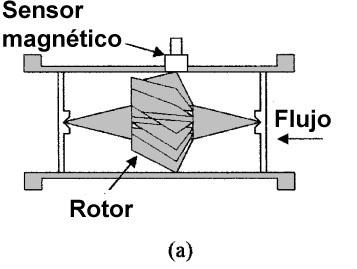 Un ejemplo de dispositivo de caudal giratorio es el caudalímetro de turbina, que se muestra en la figura a. El rotor de la turbina está montado en el centro de la tubería y gira a una velocidad proporcional a la tasa de flujo del fluido o gas que pasa sobre las paletas. Las paletas de la turbina normalmente están hechas de un material magnético o de partículas de ferrita en plástico para que no se vean afectadas por líquidos corrosivos. A medida que las paletas giran, pueden ser detectadas por un dispositivo Hall o un sensor de elemento magneto resistivo (MRE) conectado a la tubería. La turbina solo debe usarse con fluidos limpios como gasolina. Los dispositivos de flujo, también llamados flujómetros, giratorios son precisos con un buen funcionamiento de flujo y rangos de temperatura, pero son más costosos que la mayoría de los otros dispositivos. |