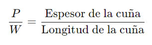 La fuerza aplicada (P) es a la carga (W), como el espesor de la cuña es a su longitud.