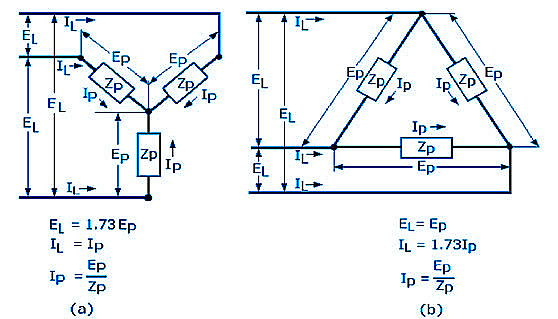 Fig: Conexiones trifásicas para una carga o fuente: (a) estrella (Y); (b) delta (Δ). |